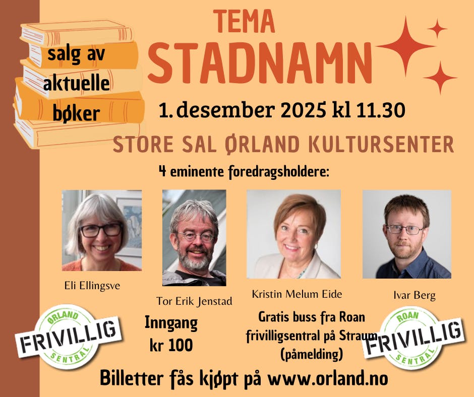 Ørland og Roan Frivilligsentral presenterer 4 foredragsholdere, som skal snakke om temaet Stadnamn.
